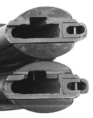 Not all 2nd series Woodsman plastic grips will interchange. The injection molded grips have tabs on the left side grip panel for rotational stability. When Colt switched from Coltwood (a material similar to Bakelite) to injection molded plastic, changes were made in the grip frame area to accomodate the tabs. Those later grips (bottom) will not fit an early type 2nd series Woodsman frame (top).