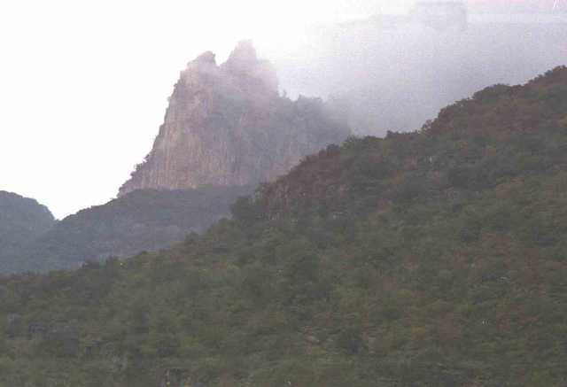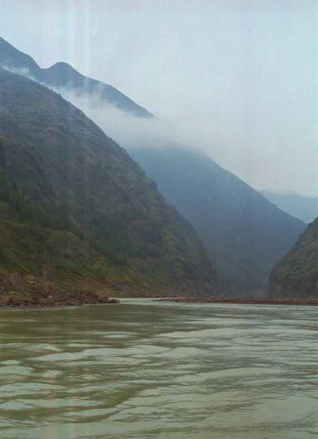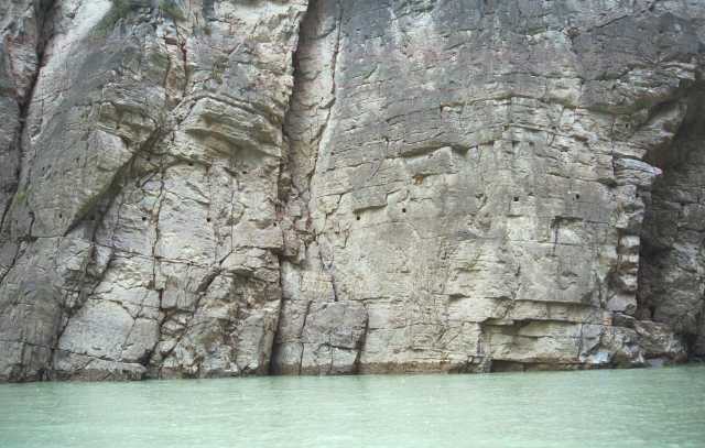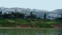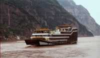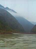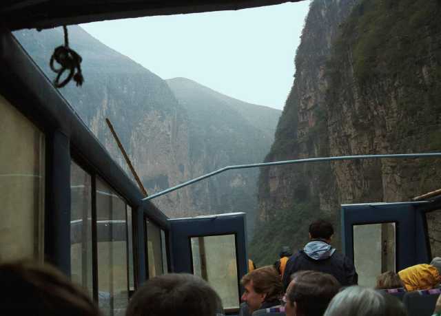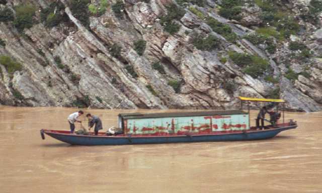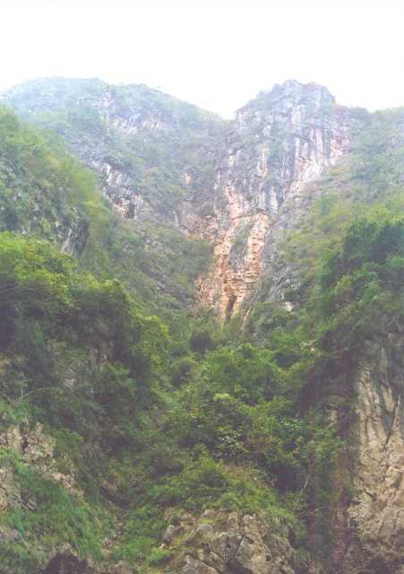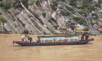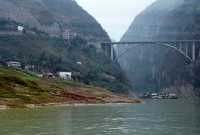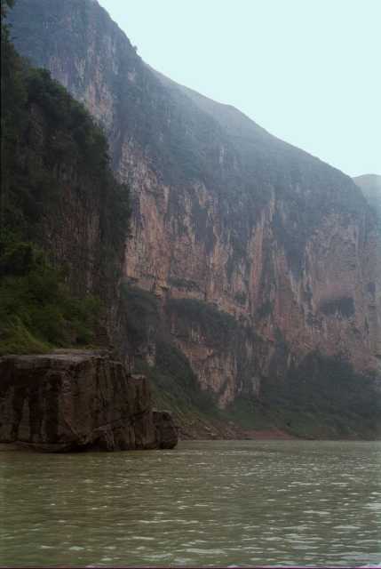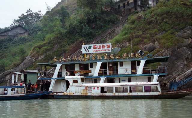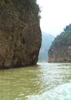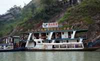 | Change to a small boat for cruise through the "Lesser Three Gorges" | The square holes in the rock face were used during the 3 Kingdoms era for supporting plank highways above the river. Pegs were placed in the holes and boards placed on top, so the soldiers could be marched relatively quickly through difficult terrain and supplies could be pulled upriver against the current. |