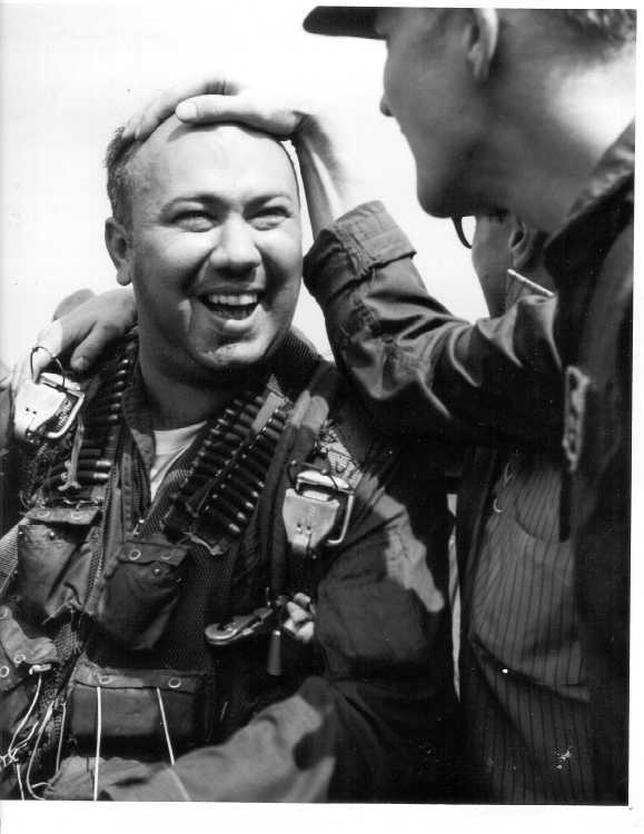 | A very happy Capt Rayburn at Ubon AB, Thailand on March 31, 1972 after helicopter rescue from enemy territory in the Laotian jungle. The entire crew was recovered. Most had only minor injuries, although some were more serious. |  |  |